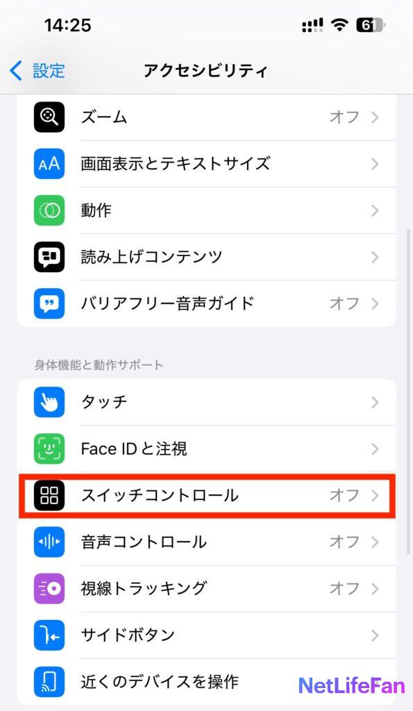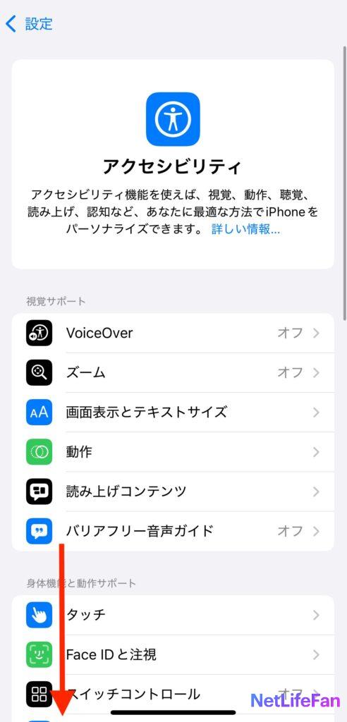 下の方にスクロールしていくと「スイッチコントロール」があるのでタップします。