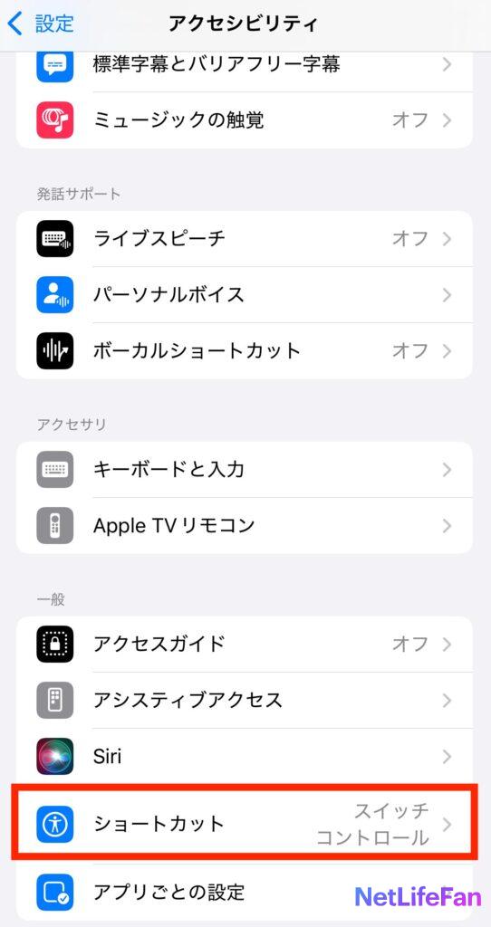 アクセシビリティの一番下に「ショートカット」があるのでタップします。