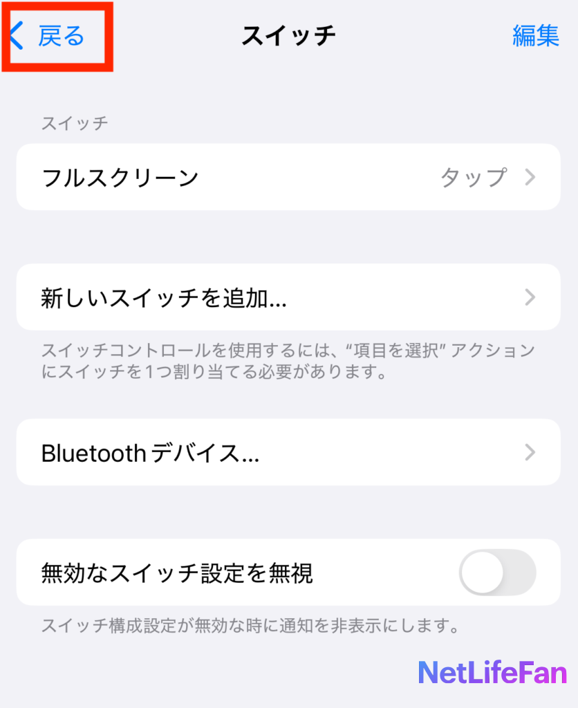 ①:スイッチコントロールの設定をタップに変更